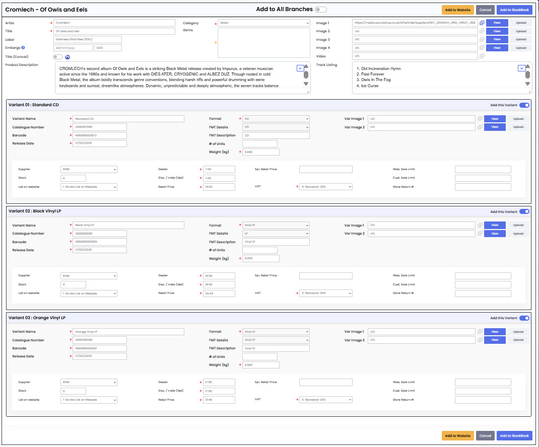 preOrderBook Lists / displays all upcoming releases as your central command centre for new product launches. This powerful feature automatically captures data from pre-order announcement emails—complete with images, track listings, multi-variants, and full release details—eliminating the need for manual data entry or copy-pasting. The preOrderBook is designed to bridge the gap between supplier announcements and your storefront. With just two clicks, items can be pushed directly to your website via the webIntegration, ensuring you are direct to market without the risk of missed launches. It provides one central, reliable place to manage the entire pre-order lifecycle, allowing you to get new releases live faster than ever with zero hassle.