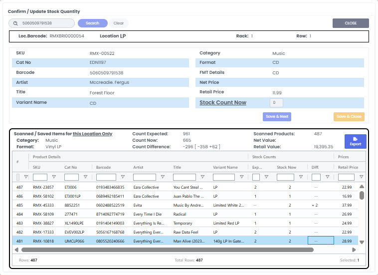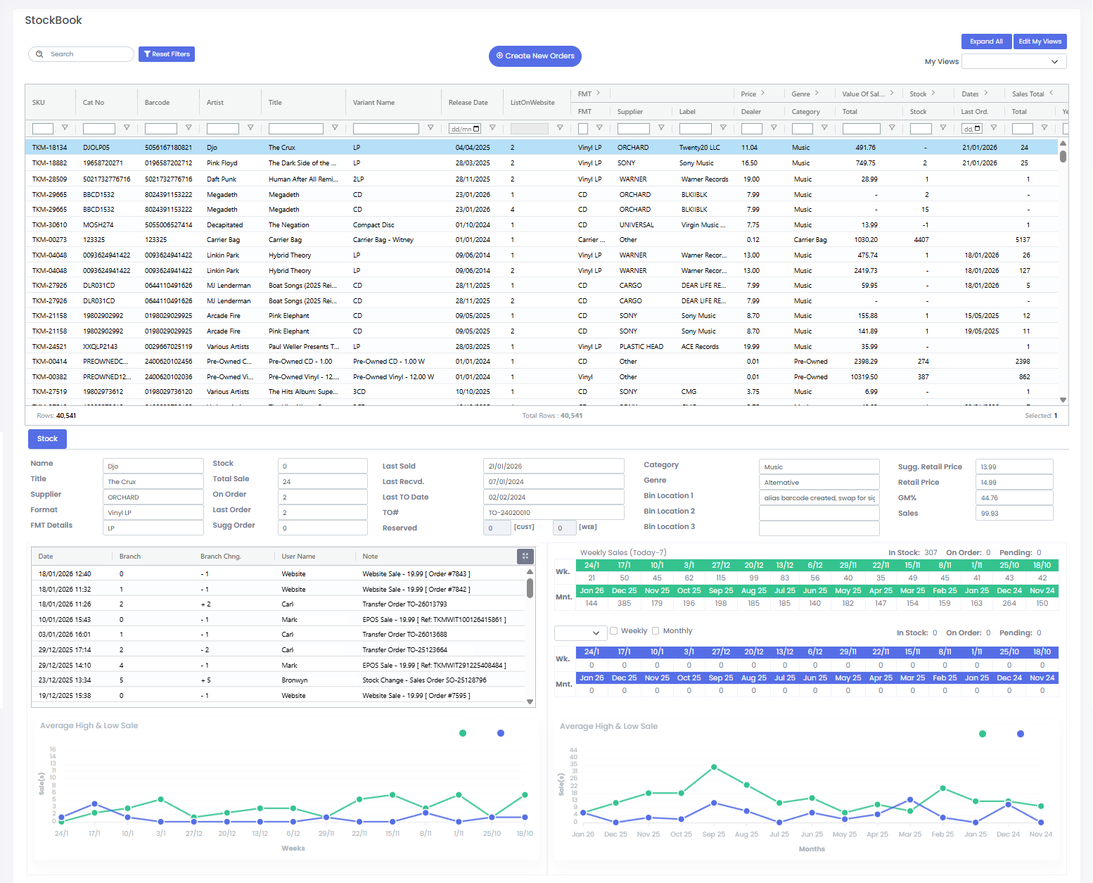 stockBook Lists / displays all inventory levels by Category, Location, Format, Genre, SKU, CatNo/Barcode, Status, etc. It enables real-time tracking of stock-on-hand, reserved units, and incoming replenishment sourced from the orderBook. The stockBook allows for information to be cross-referenced from the searchBook in one click, making it simple to perform stock adjustments, audits, or transfers. It is designed to automate inventory reconciliation, ensuring that stock levels are dynamically updated as orders are fulfilled, removing the need for manual spreadsheet logging or data duplication. Automated Push/Pull Stock and other details to & from Website within seconds, ensuring no oversell on integrated EPOS.